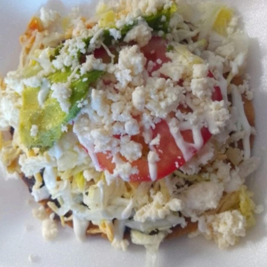 Frijol,lechuga,pollo,crema,queso y aguacate y tomate