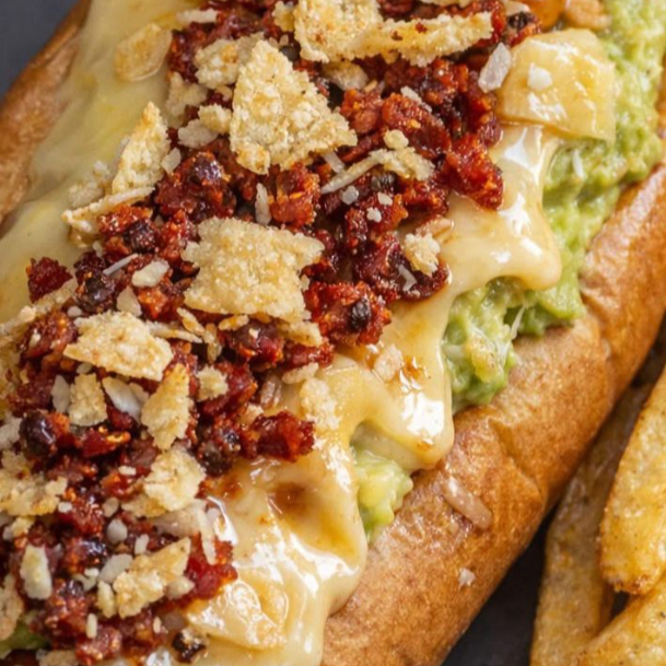 SALCHICHA, PAN BRIOCHE, MAYONESA, TOMATE, AGUACATE, SALSA AGUACHILE DE LA CASA