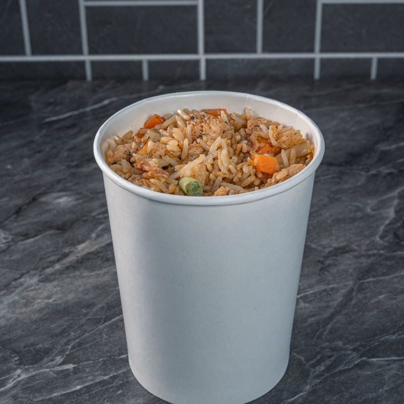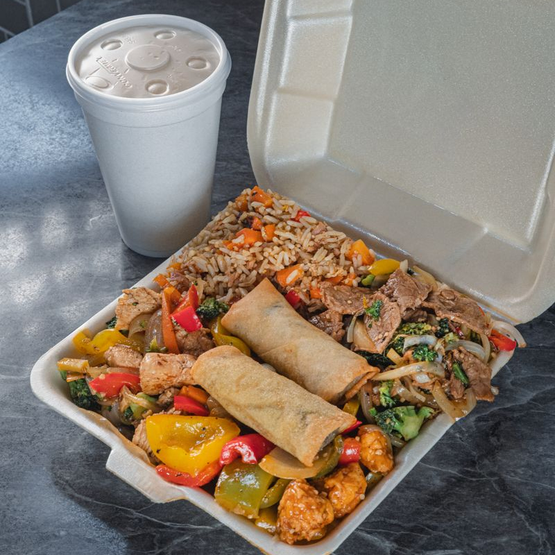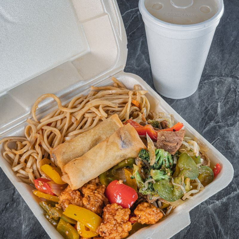 Disfruta de chow fan (arroz frito 200 gr.) o chow mein (pasta 200 gr.) ,tres guisos de tu elección (125 gr.), 2 rollos pimavera y bebida del día (473 ml.)