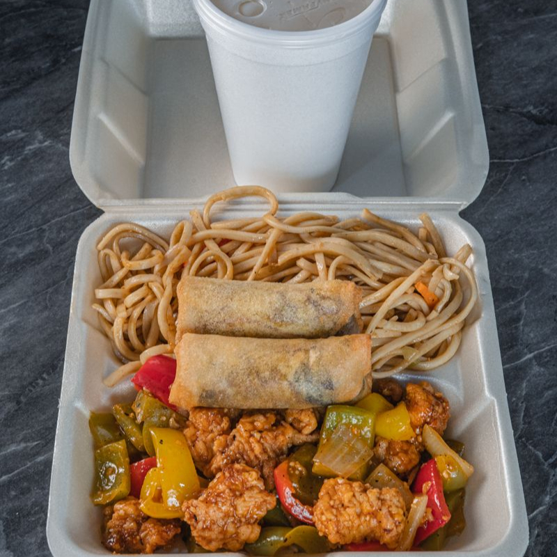 Disfruta de chow fan (arroz frito 200 gr.) o chow mein (pasta 200 gr.) ,un guiso de tu elección (125 gr.), dos rollos primavera y bebida del día (473 ml.)