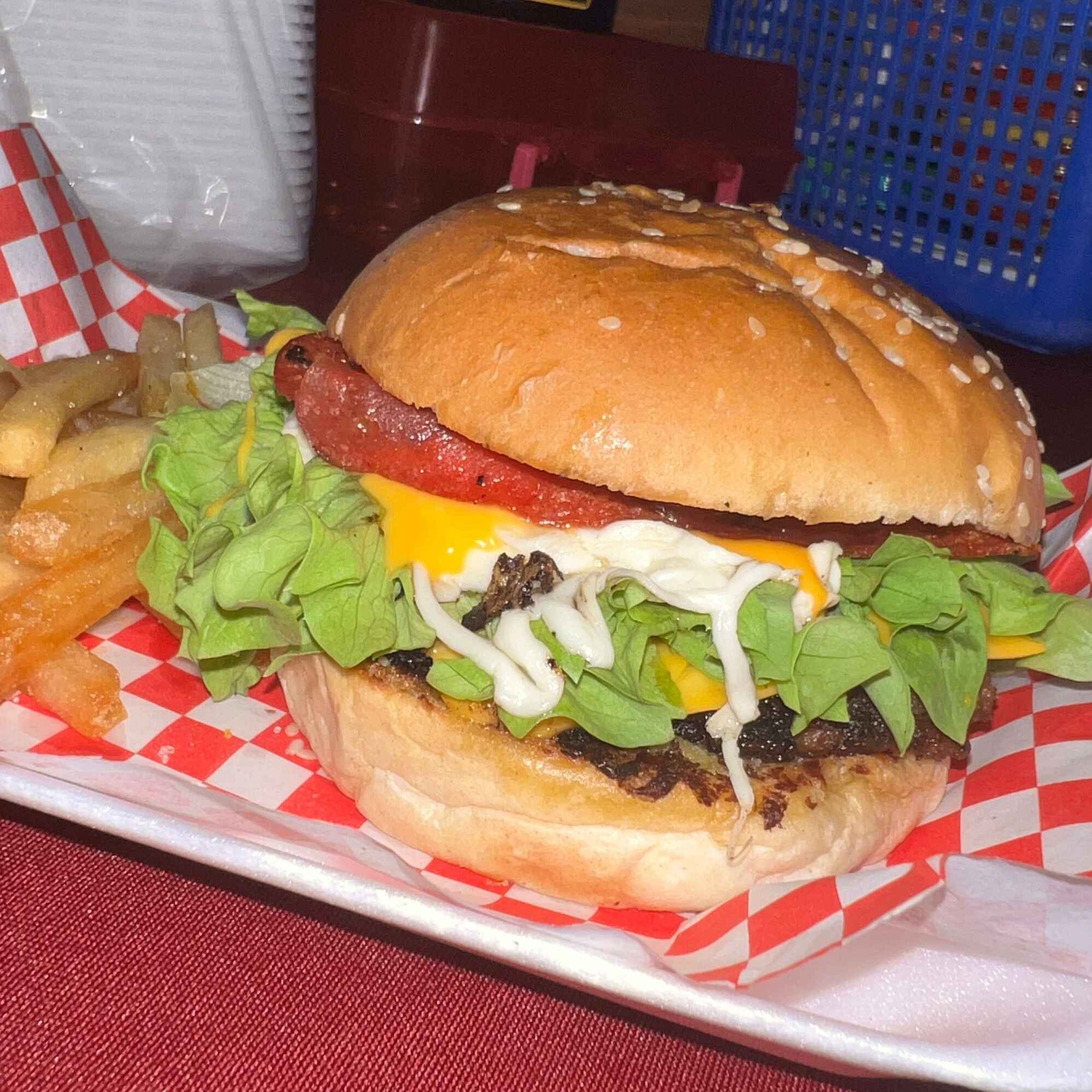 carne de res, lechuga, jitomate, cebolla asada, catsup, mayonesa, mostaza, queso oaxaca gratinado y tocino, acompañado de papasa la francesa