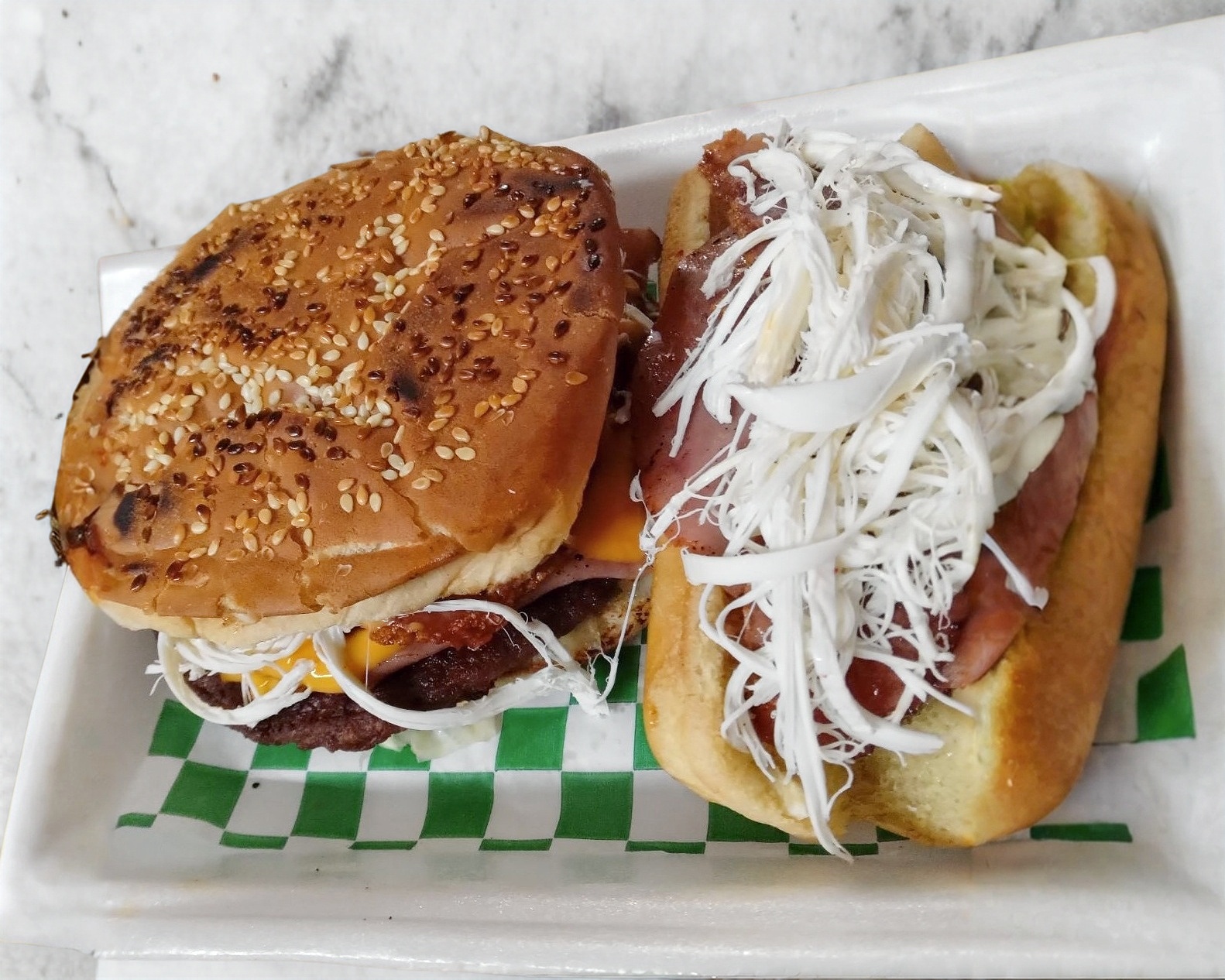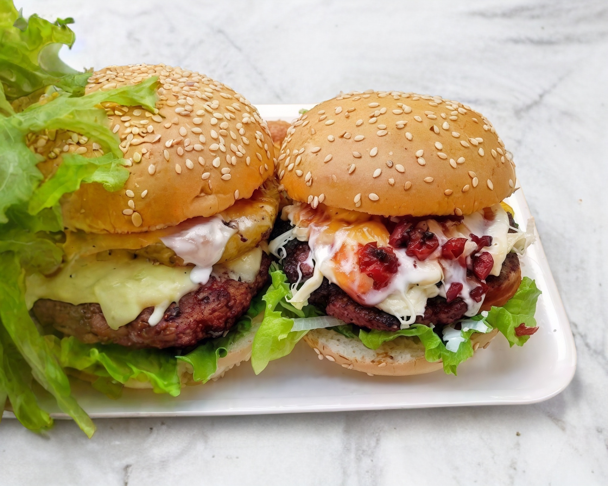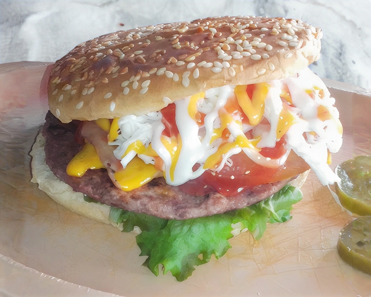 Hamburguesa grande,pan,carne, vegetales,chorizo cosido y queso de hebra derretido