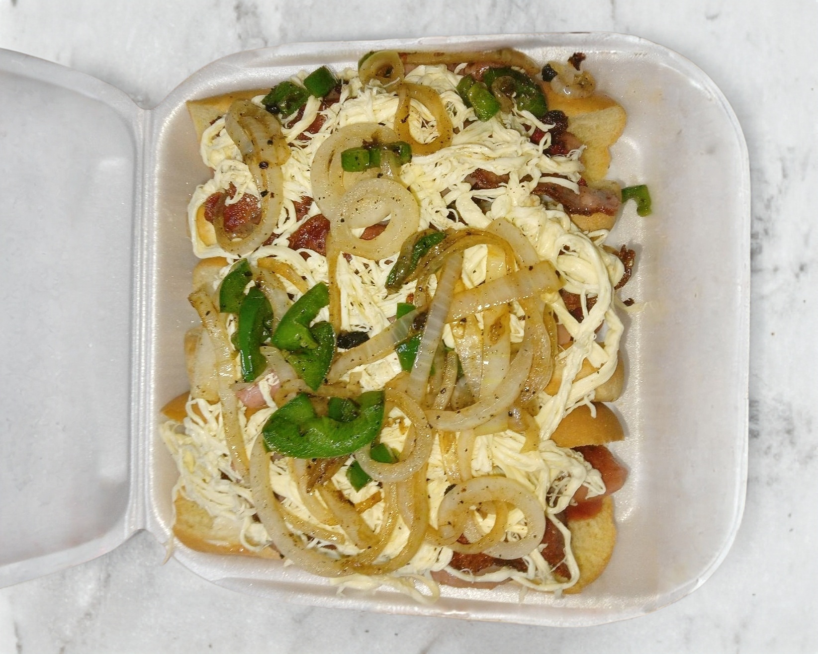 Pan, salchicha,tomate cebolla aderezos,chorizo,jamón y tocino con queso de hebra