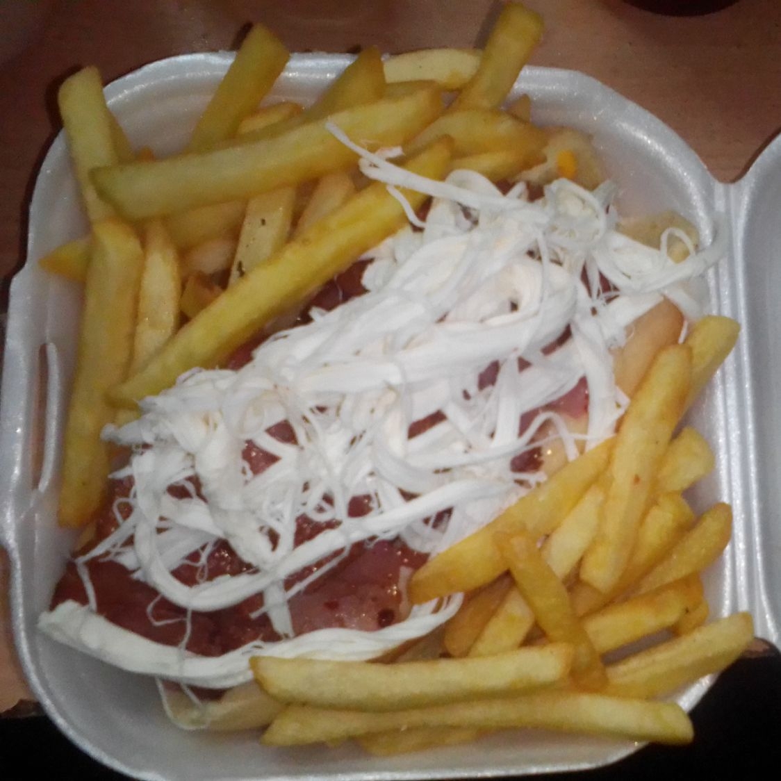 Pan,salchicha,tomate, cebolla, aderezos a elegir con queso de hebra derretido con chorizo