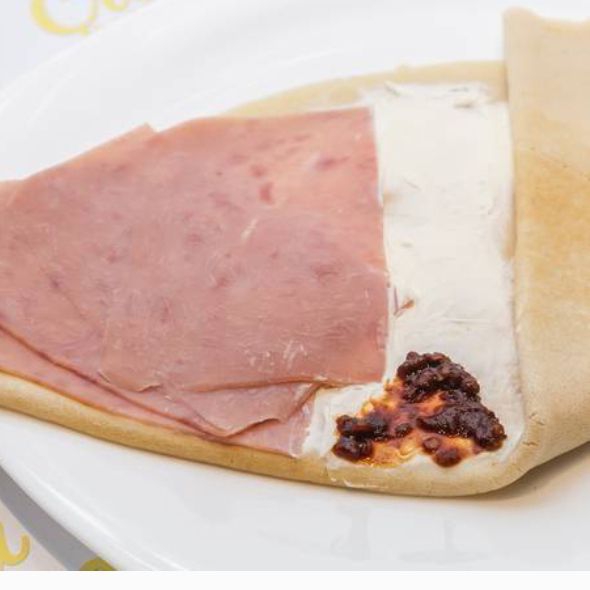 Prueba nuestra deliciosa crepa con masa renovada más deliciosa con exquisito queso crema Philadelphia y jamón.