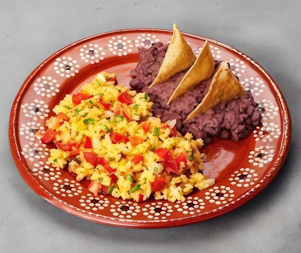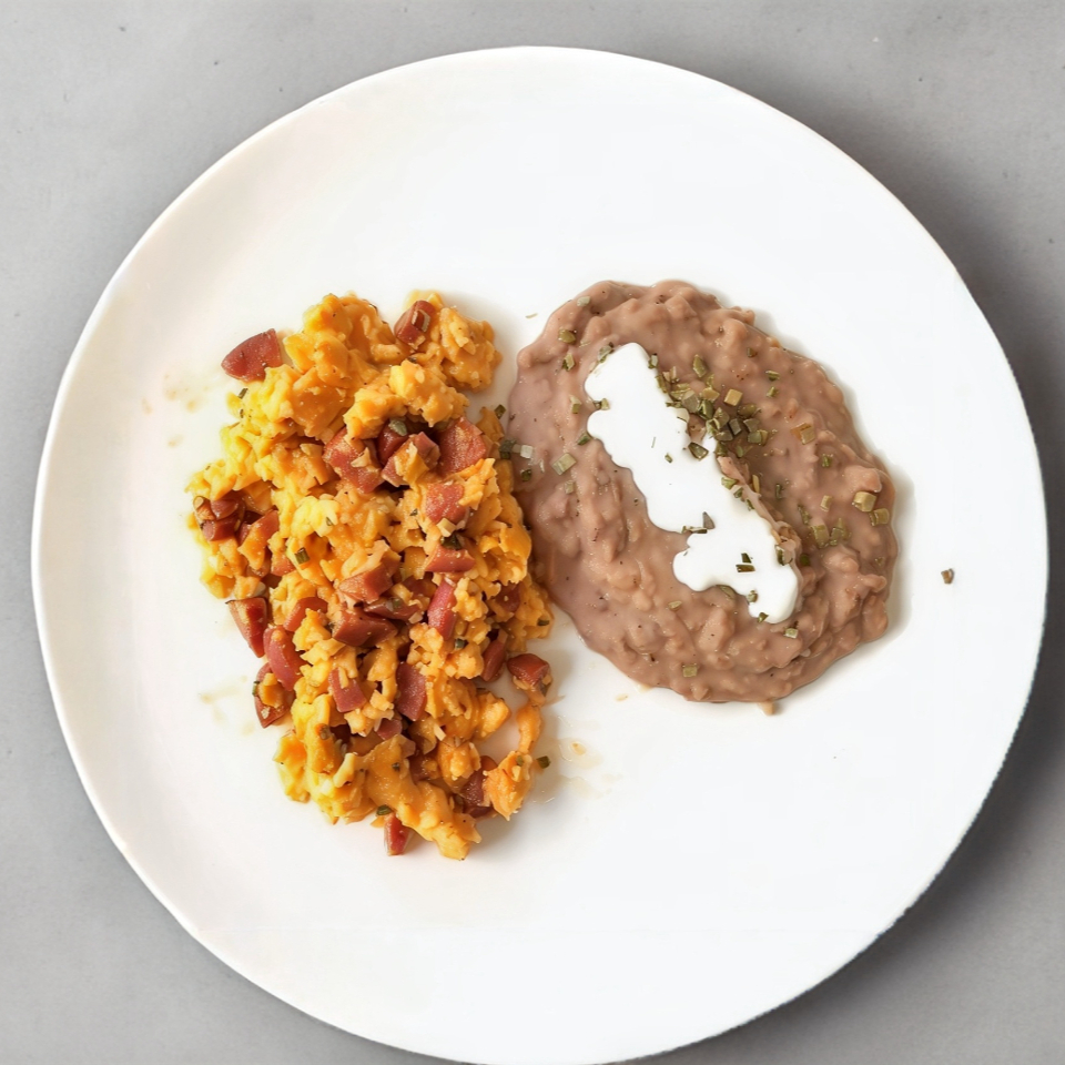 Tres huevos con jitomate, cebolla y chile; acompañada con frijoles refritos y tortillas hechas a mano.