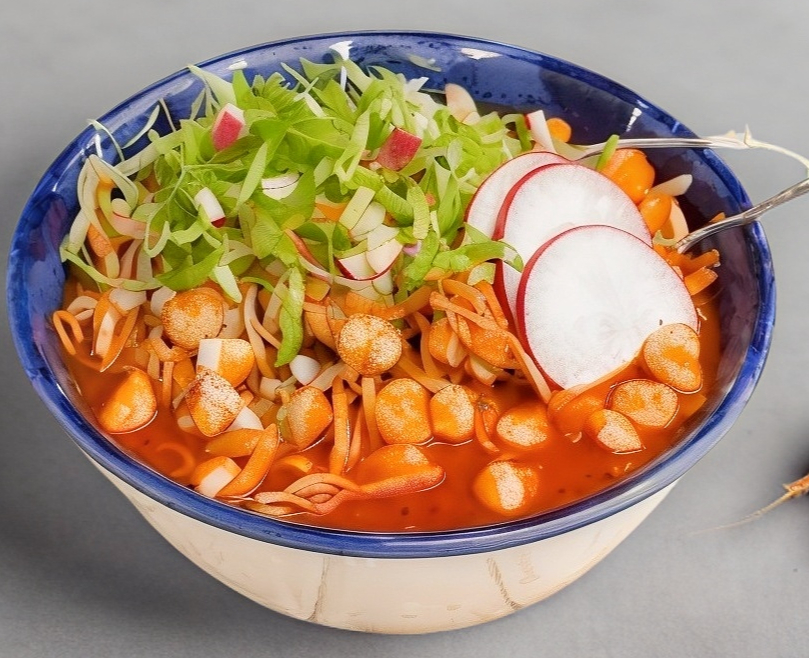 Pozole acompañado con cebolla picada, lechuga, chile de árbol, rábano, limón y totopos.