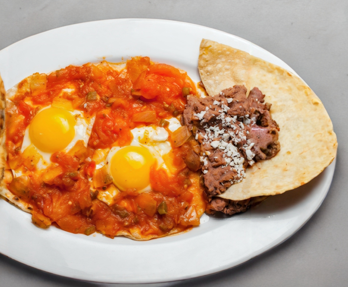 Dos huevos estrellados sobre dos tortillas y bañados en salsa de tomate, acompañados de frijoles refritos y tortillas hechas a mano