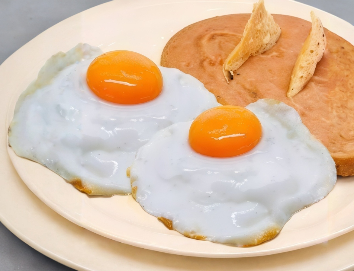 Dos huevos estrellados acompañados de frijoles refritos y tortillas hechas a mano.