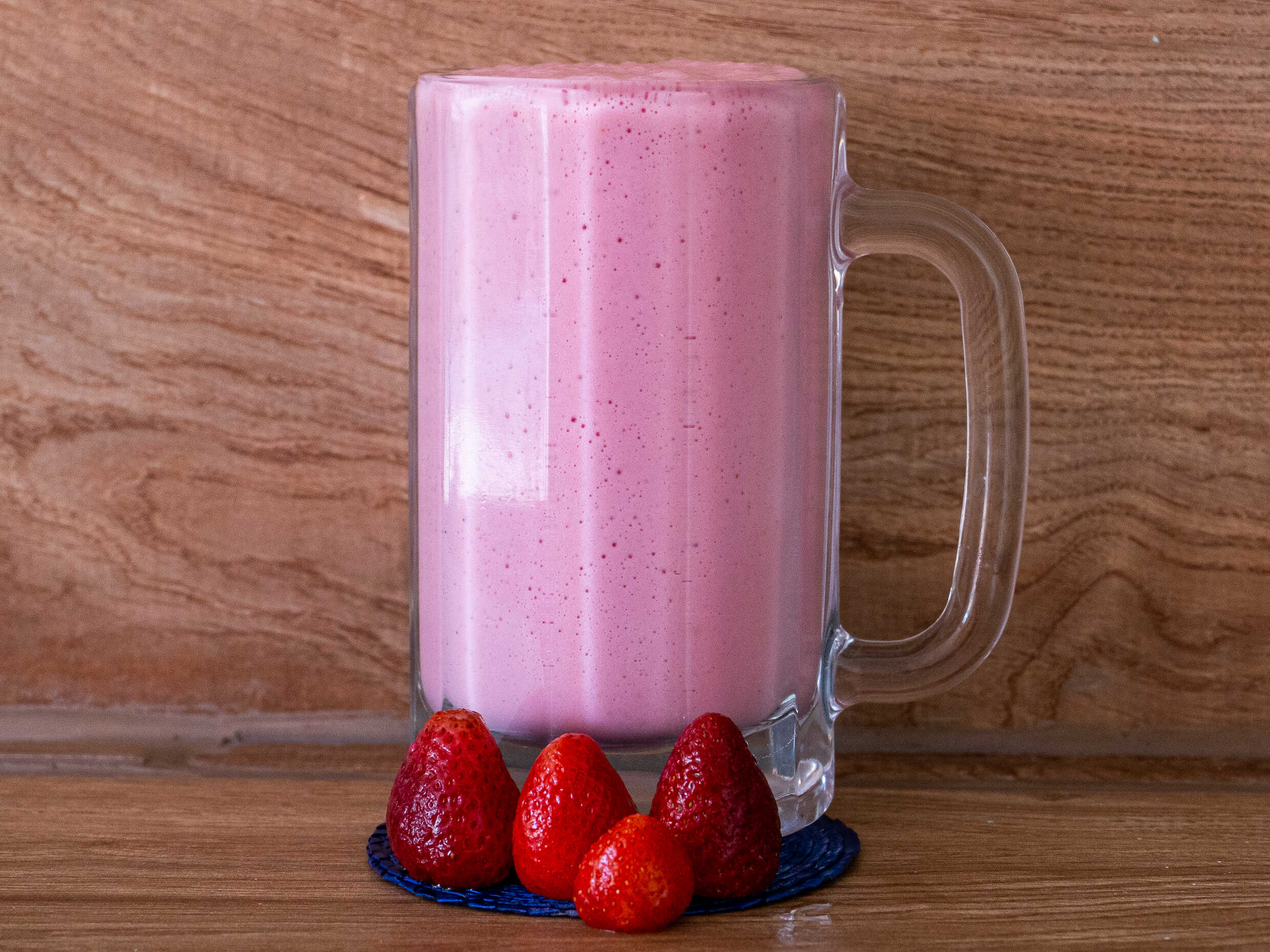 Agua de fresa 100 % natural, realizada al instante con agua, fresa natural, azúcar y hielo.
