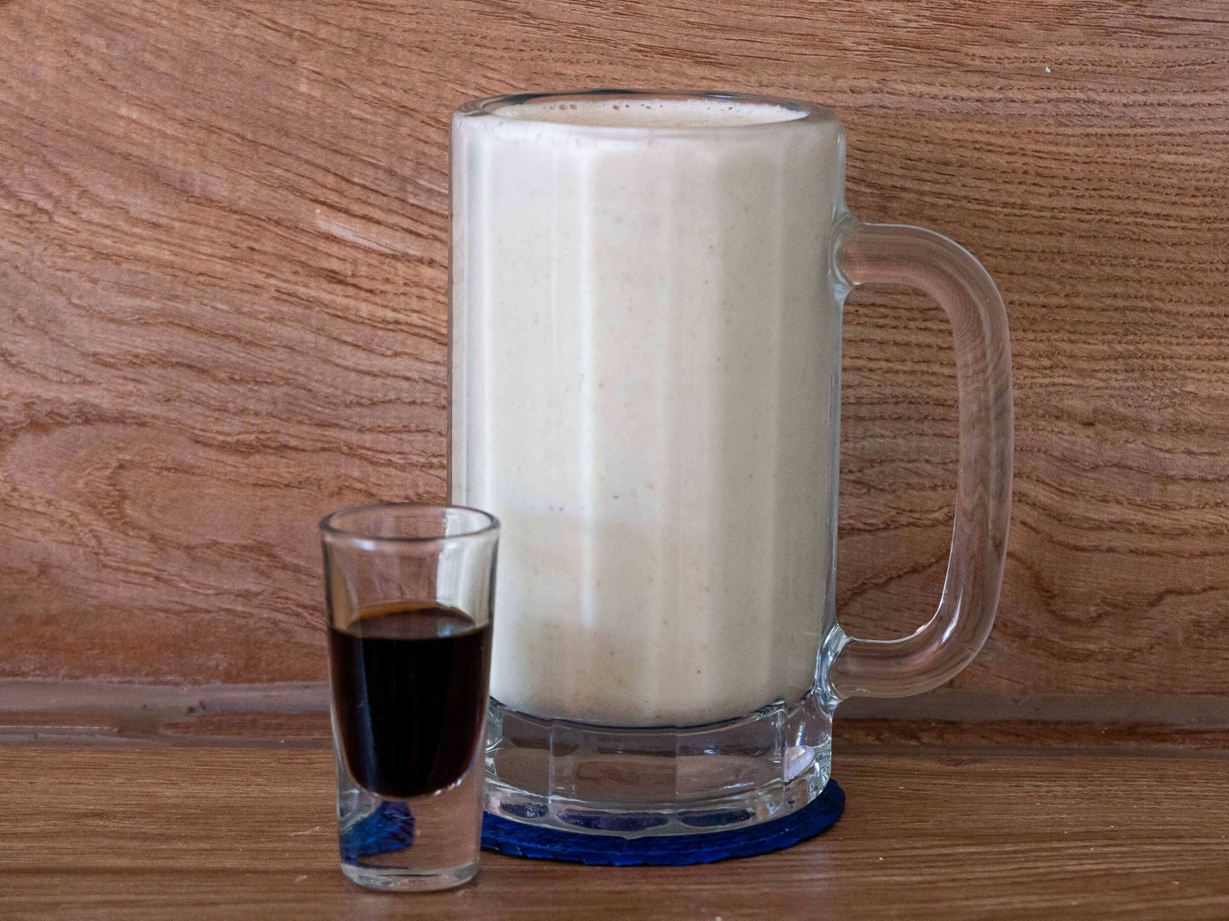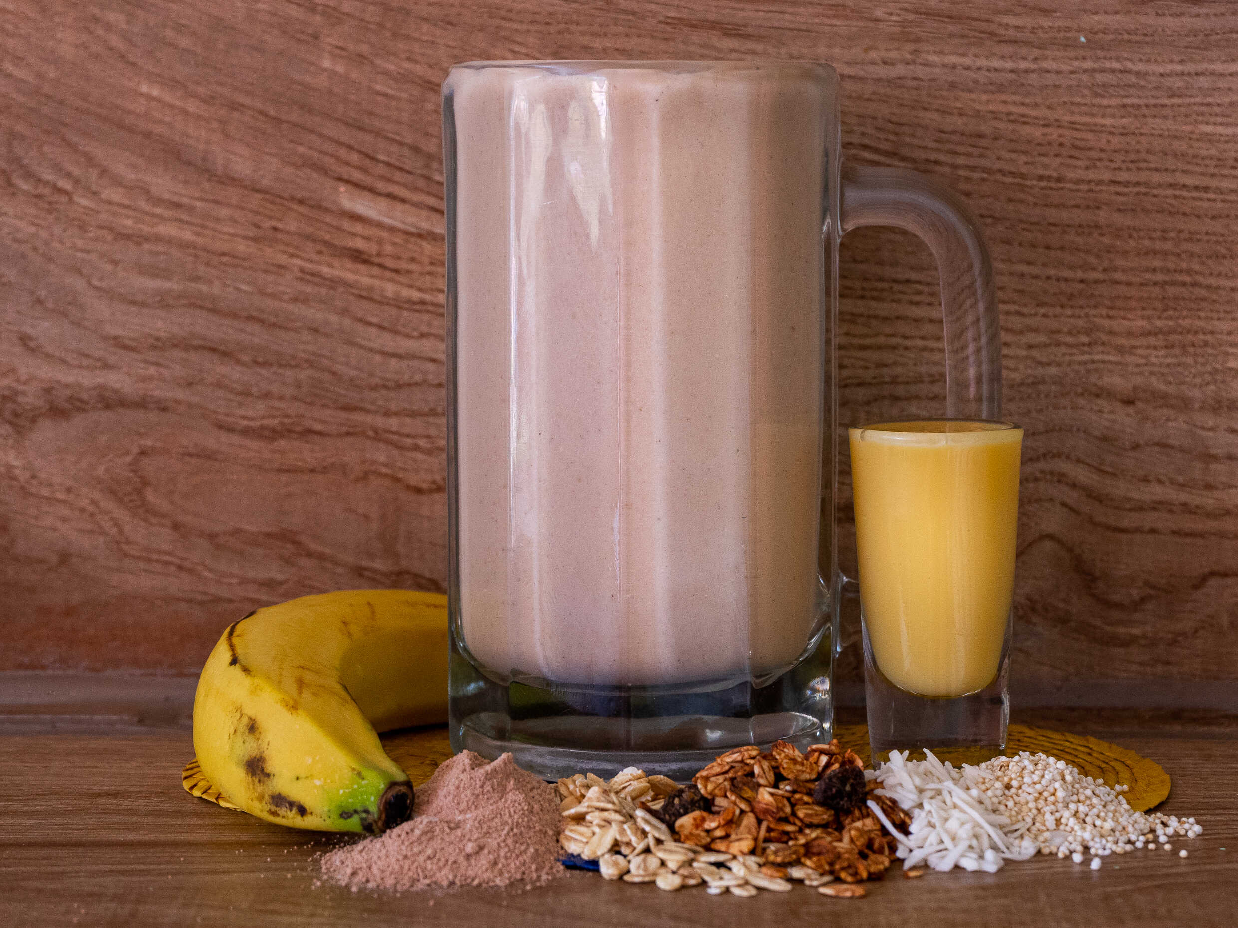 1/2 Litro chocolate, plátano, granola, amaranto, coco, rompope, pasitas, leche, azúcar, vainilla, canela, hielo.