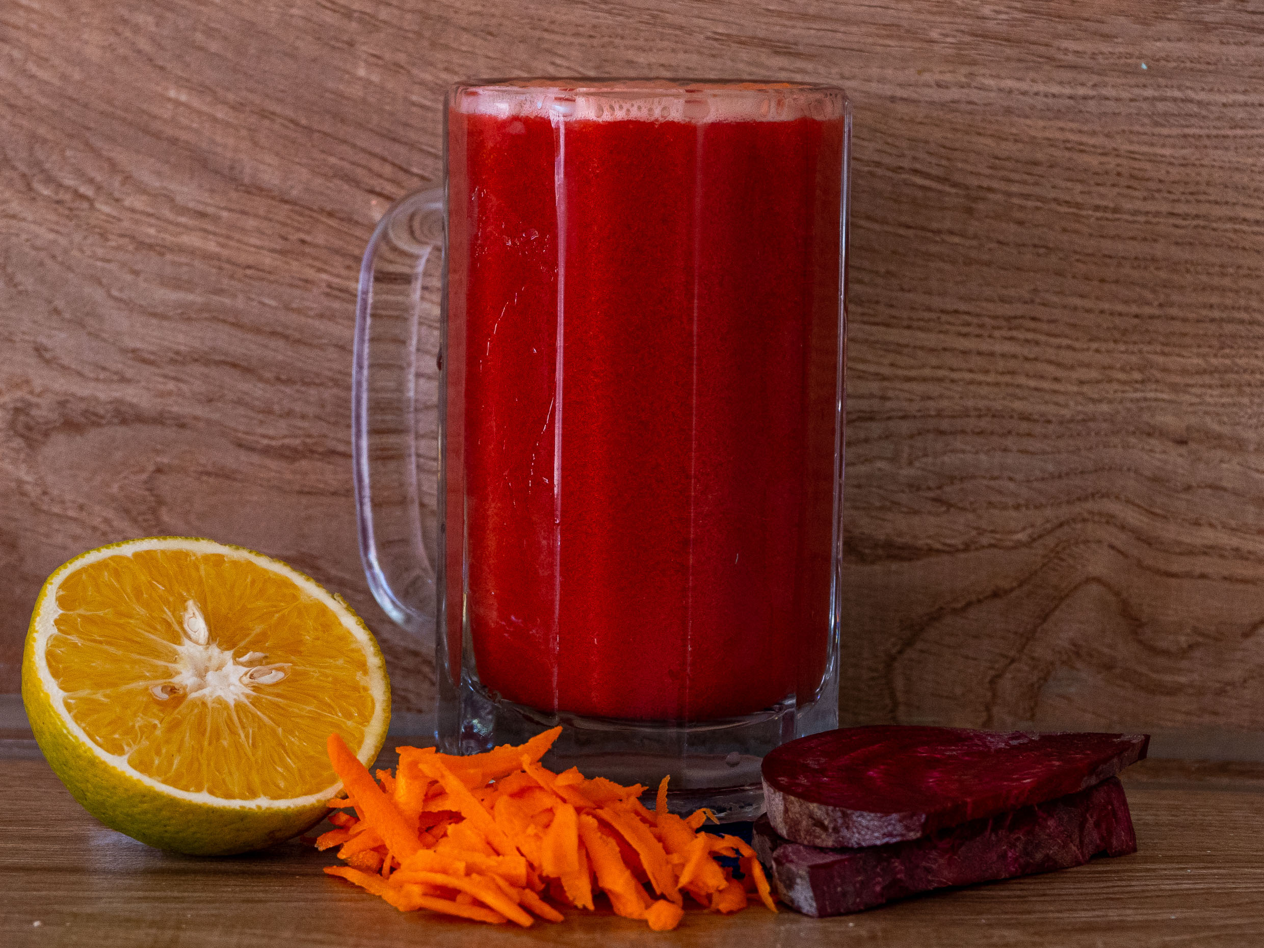 Exquisita combinación de jugo de betabel, jugo de zanahoria y jugo de naranja 100% natural y preparado al instante
