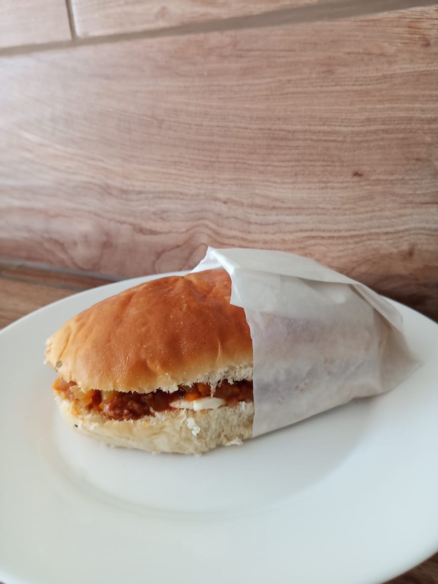 Pan de media noche, carne preparada estilo boloñesa, queso fresco, mayonesa