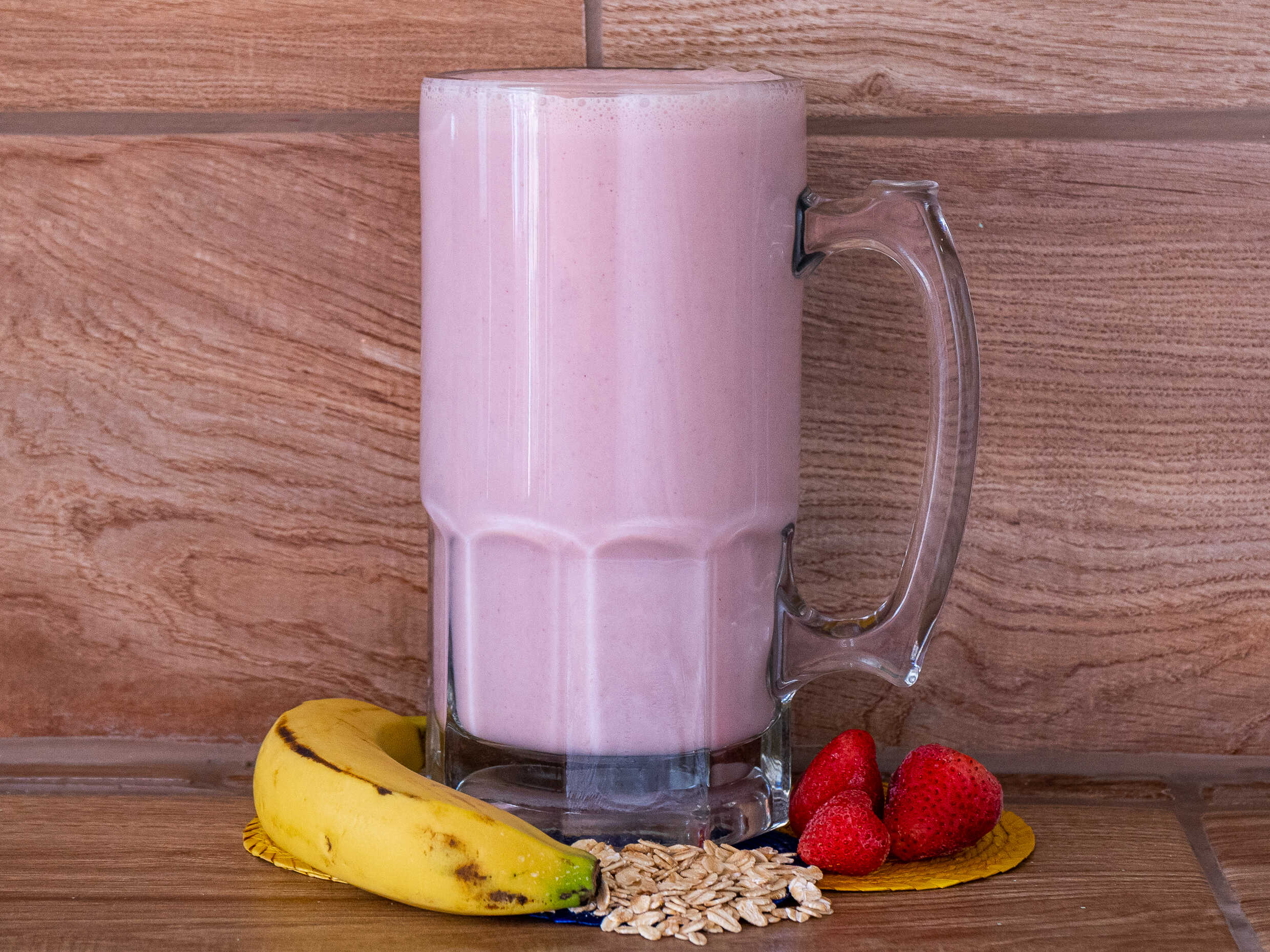 1/2 Litro plátano, fresa, avena, leche, azúcar, vainilla, canela, hielo.