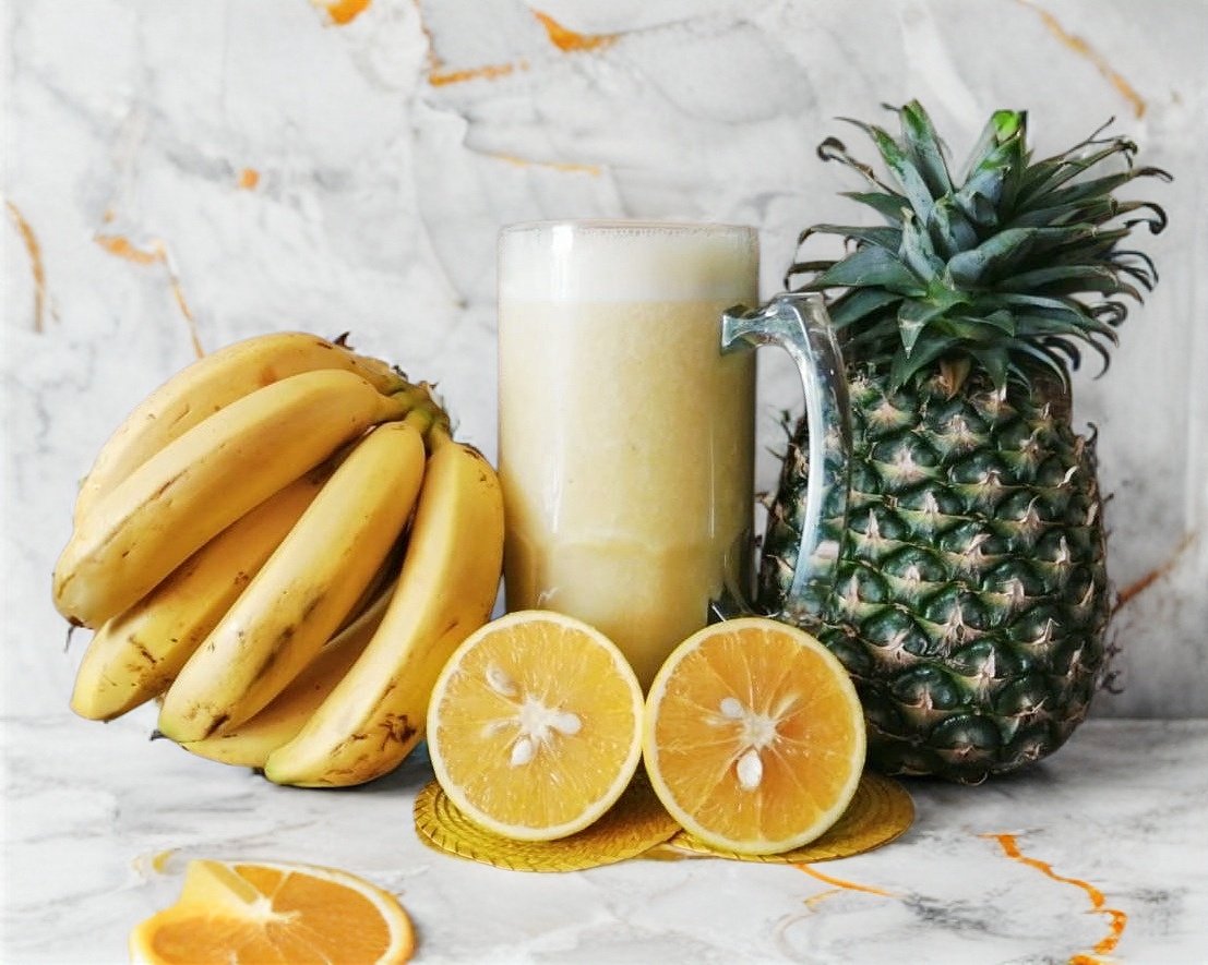 Deliciosa combinacion licuada de Piña, Plátano y jugo de Naranja