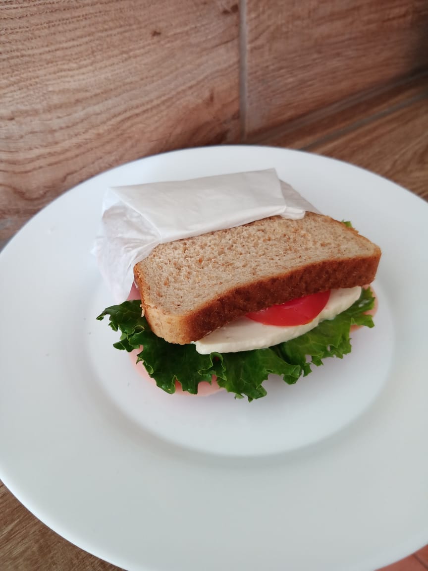 Pan integral, mayonesa, frijoles, jamón de pavo, queso fresco, tomate, lechuga.