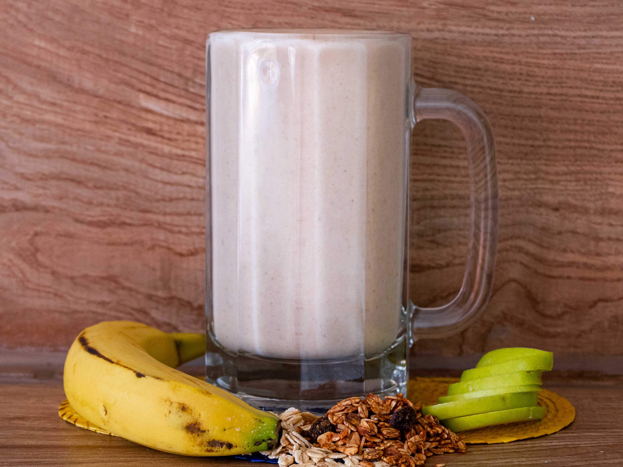 1/2 Litro plátano, manzana, avena, granola, leche, azúcar, vainilla, canela, hielo.