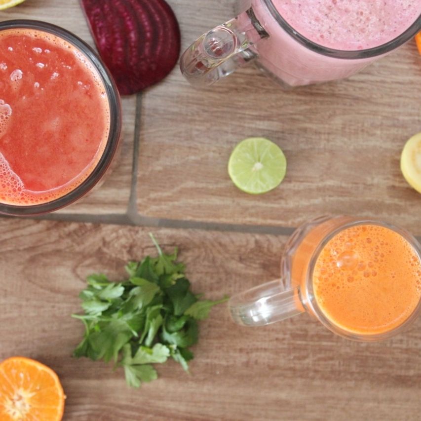 Jugo de naranja, jugo de betabel, jugo de zanahoria, apio y perejil.
