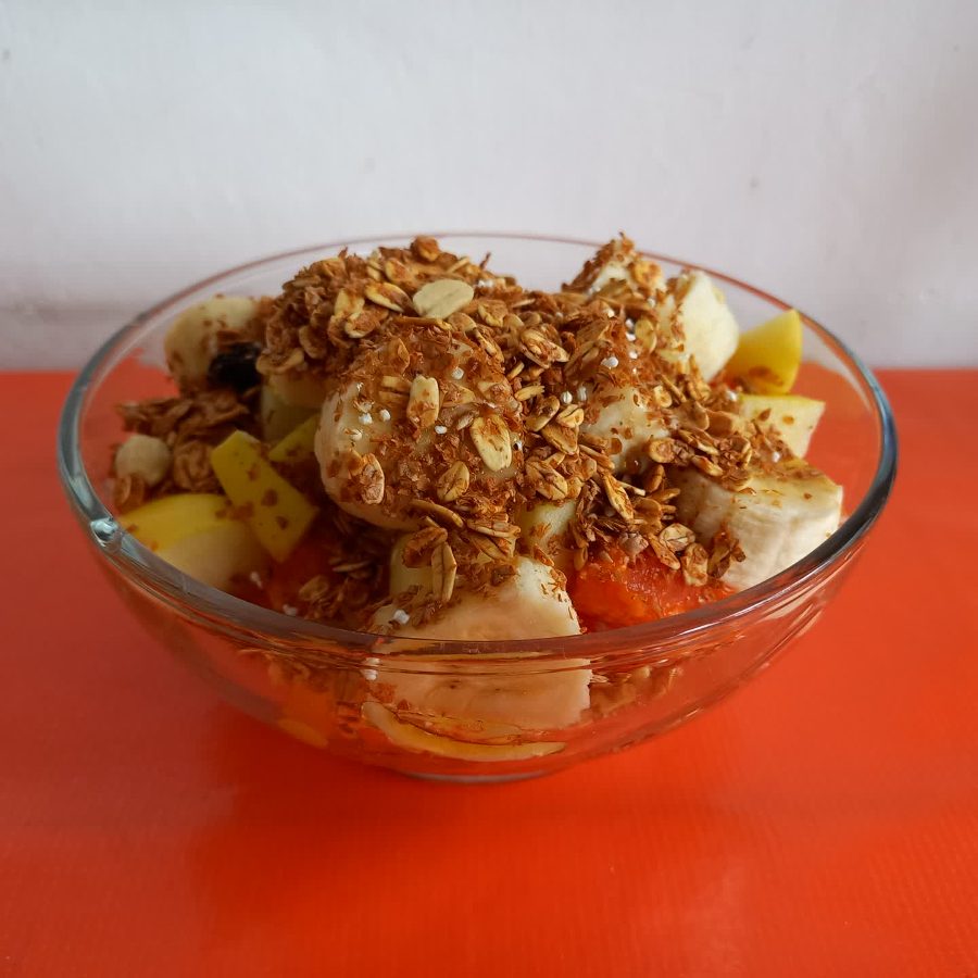 Papaya, manzana, plátano, yogur, granola, y miel.