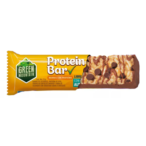 Barra de cacahuate, proteína de soya, chispas de chocolate amargo, y crema de cacahuate. 10g de proteína.
