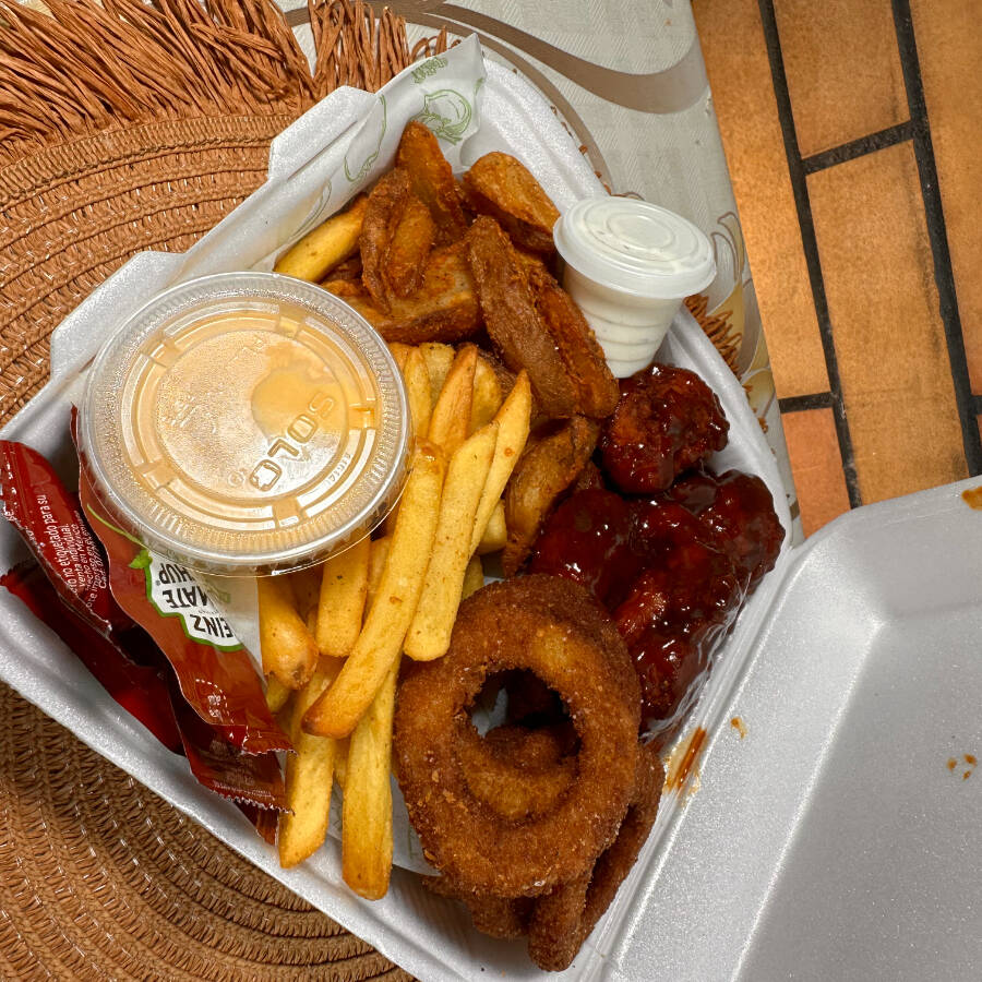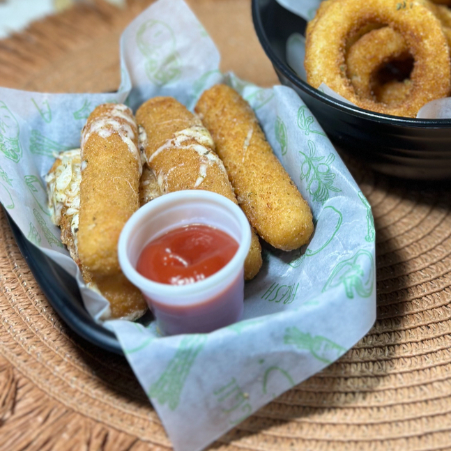 papas gajo, papas francesa, dedos de queso, aros de cebolla, boneless bbq