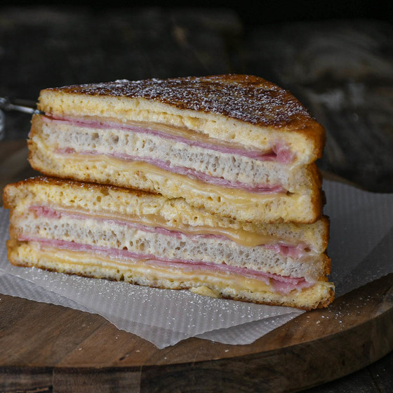 sándwich 2 pisos, jamón y pollo asado con verduras, acompañado de papas veggies