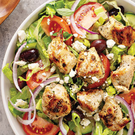 Lechuga, espinaca, zanahoria, tomate, pepino, alfalfa, queso panela, aguacate, pollo, crotones.