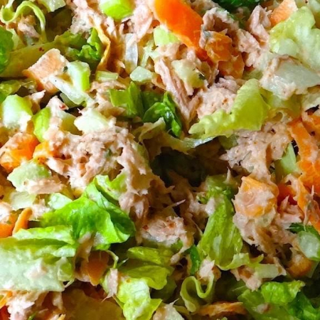 Lechuga, espinaca, tomate, pepino, alfalfa, queso panela, aguacate, pasta de tornillo, atún, crotones