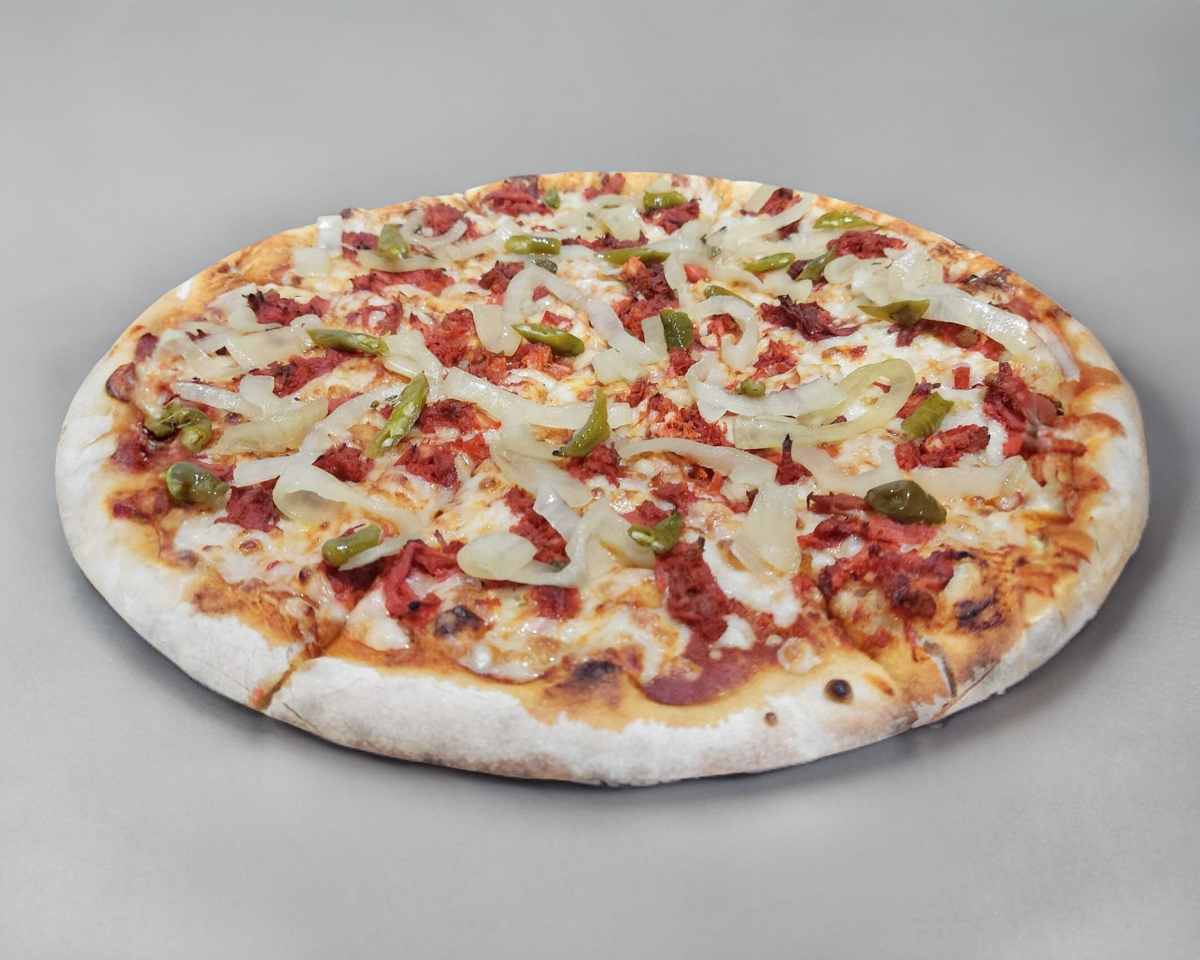 Pizza casera, con salsa de tomate, mozzarella, arrachera, chistorra y salchichón.