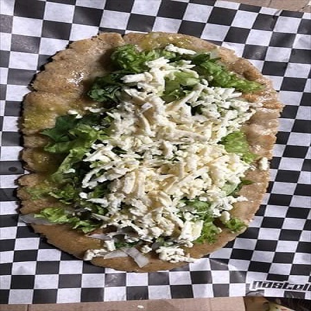 tortilla ovalada de buen tamaño con salsa, chicharon prensado, lechuga, queso y crema