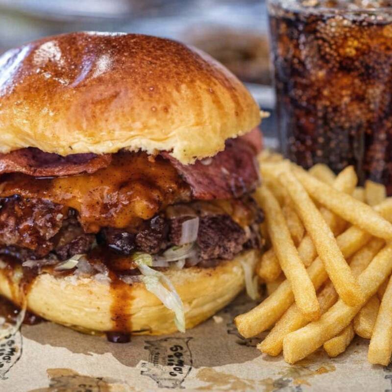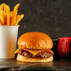 Deliciosa hamburguesa con queso y Papas Con Refresco al Azar Gratis