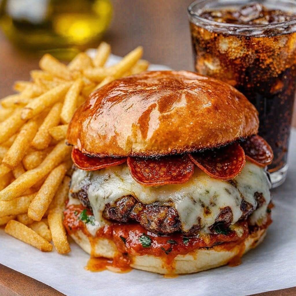 Deliciosa Pizza Burger con Carne 100% res y pepperoni original gran sabor con salsa de pizza y queso manchego para 1 persona