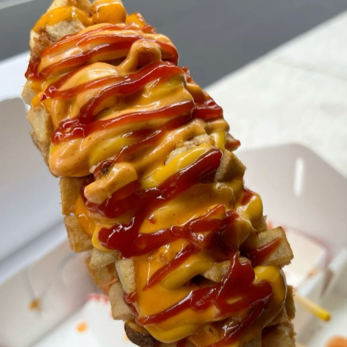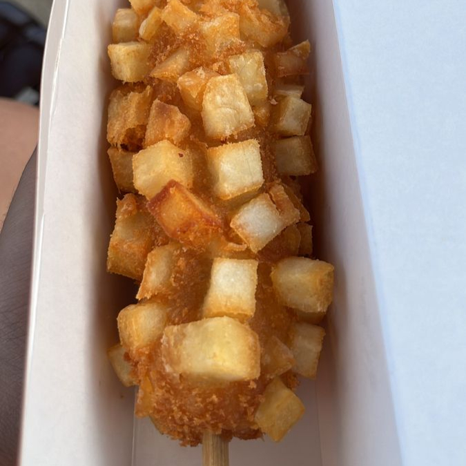 Banderilla coreana de queso con cubierta de papa, elige hasta 3 de los aderezos: ranch, bbq, búfalo, mostaza, cátsup, queso amarillo, aderezo de la casa (chile de árbol).