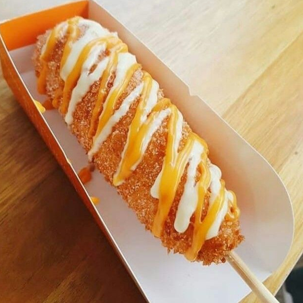 Banderilla coreana de salchicha con cubierta de papa, elige hasta 3 de los aderezos: ranch, bbq, búfalo, mostaza, cátsup, queso amarillo, aderezo de la casa (chile de árbol).