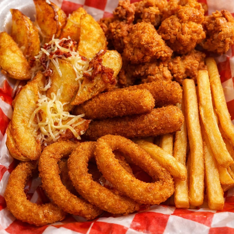 (charola de Snack variados, incluye boneless, aros de cebolla, dedos de queso, papas a la francesa, Papas en gajo con queso parmesano rallado) Salsa de tu preferencia: Ranch, BBQ, Búfalo, Macha, queso chedar líquido.