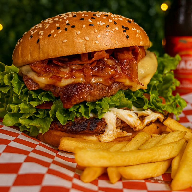 doble carne, queso de hebra, queso gouda, mermelada de tocino, jitomate, cebolla, lechuga, jalapeño y 100 gr de papas a la francesa