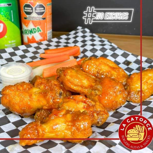 seis pzas de alitas con la salsa de su preferencia, acompañada de vegetales