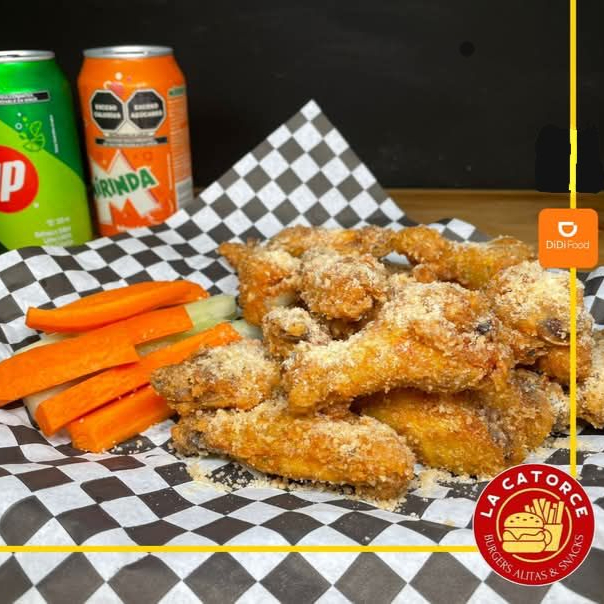 dieciocho pzas de alitas con la salsa de su preferencia, acompañada de vegetales