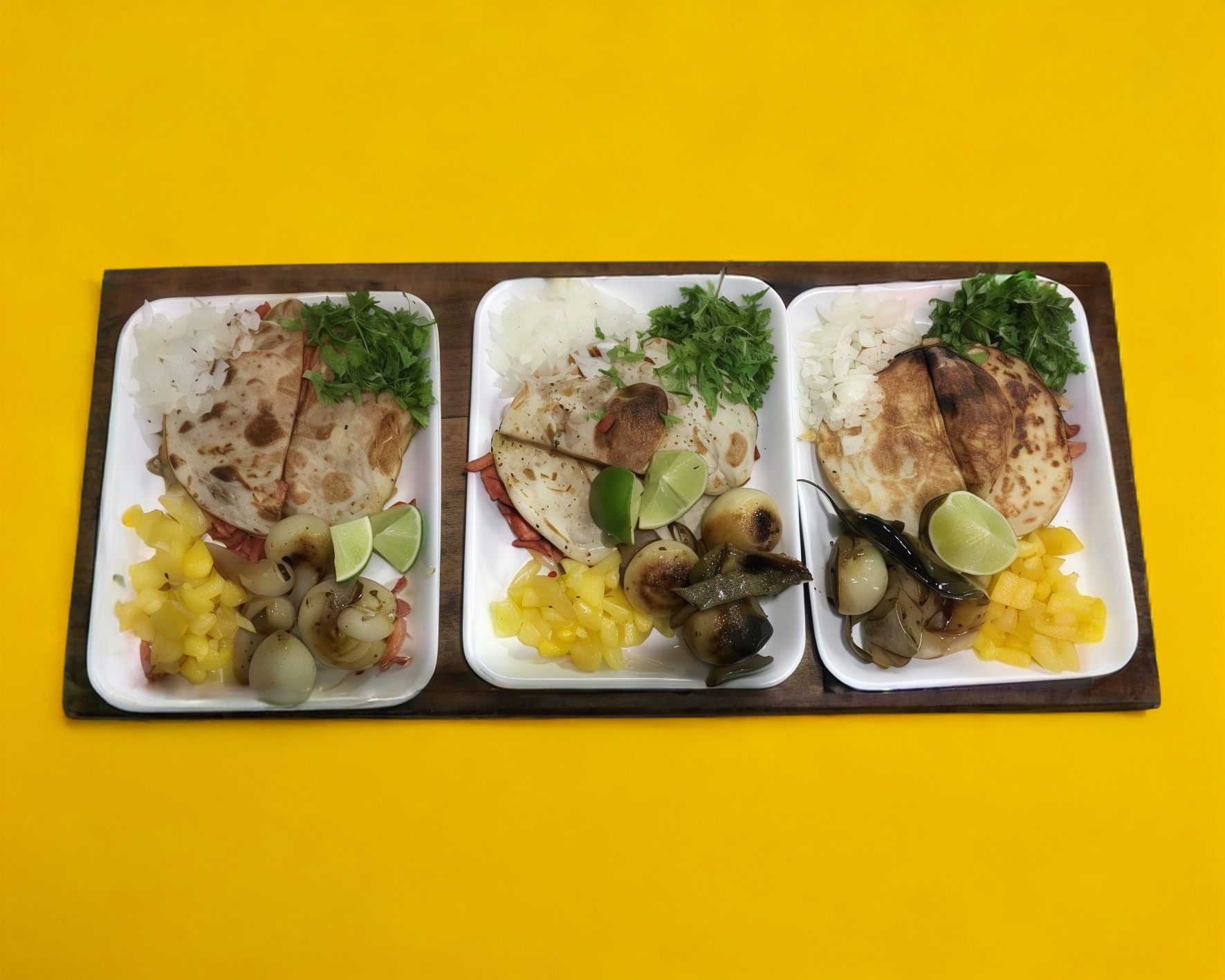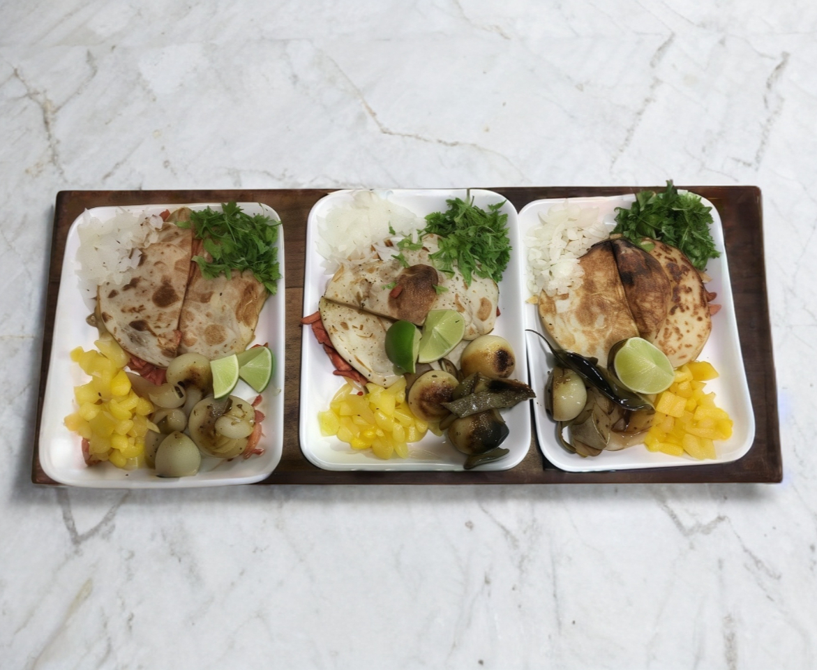 Cebolla, cilantro, Guarnición de Rábano y ensalada de nopal, cebolla asada y cebollín
