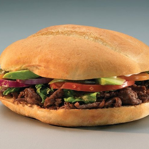 Torta de arrachera con queso manchego, frijoles, lechuga, tomate, cebolla asada