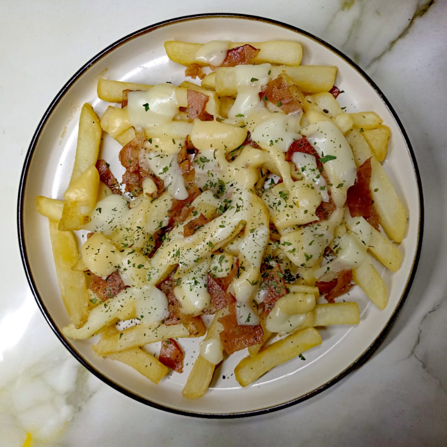Deliciosas y crujientes papas a la francesa, bañadas en una deliciosa salsa de 3 quesos hecho al momento, servidas con trocitos de tocino crujiente y perejil deshidratado.