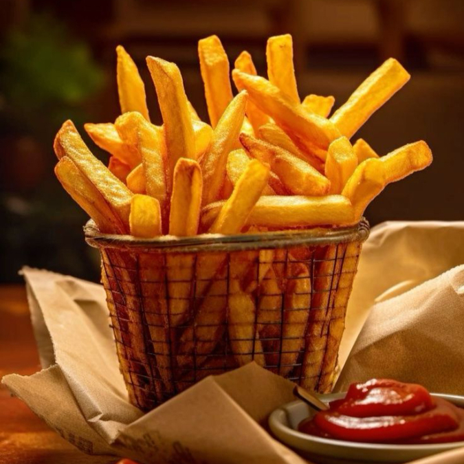 Orden de papas a la francesa, corte 3/8, crujientes por fuera y suaves por dentro, con un toque de sal, hechas al momento.