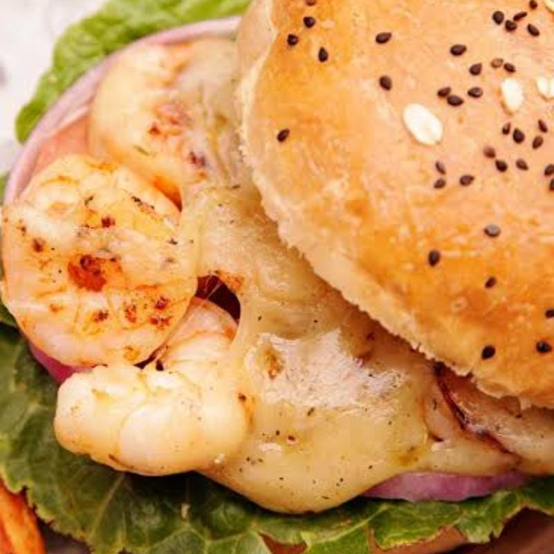 El match perfecto para ti, una combinacion de carne de res (150 g) con camarones a la mantequilla sazonados y gratinados con queso suizo y americano, servida en pan de sesamo mixto, aderezado con mayonesa picante, rebanadas de cremoso aguacate y lechuga italiana fresca. Incluye papas a la francesa o gajo a elegir.