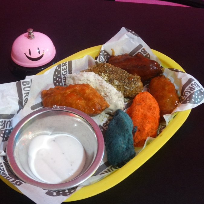 alitas bañadas en salsa, con aderezo ranche,pepino y zanahoria