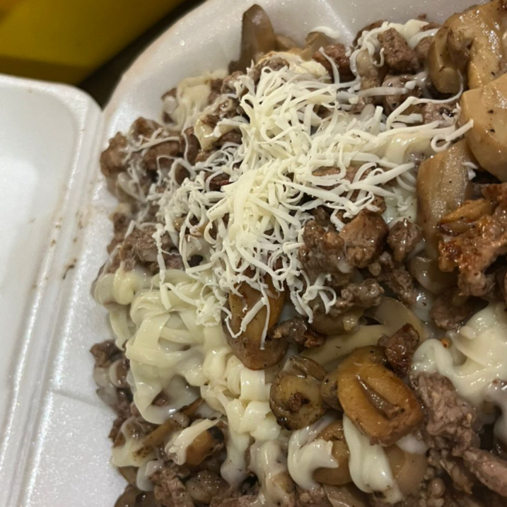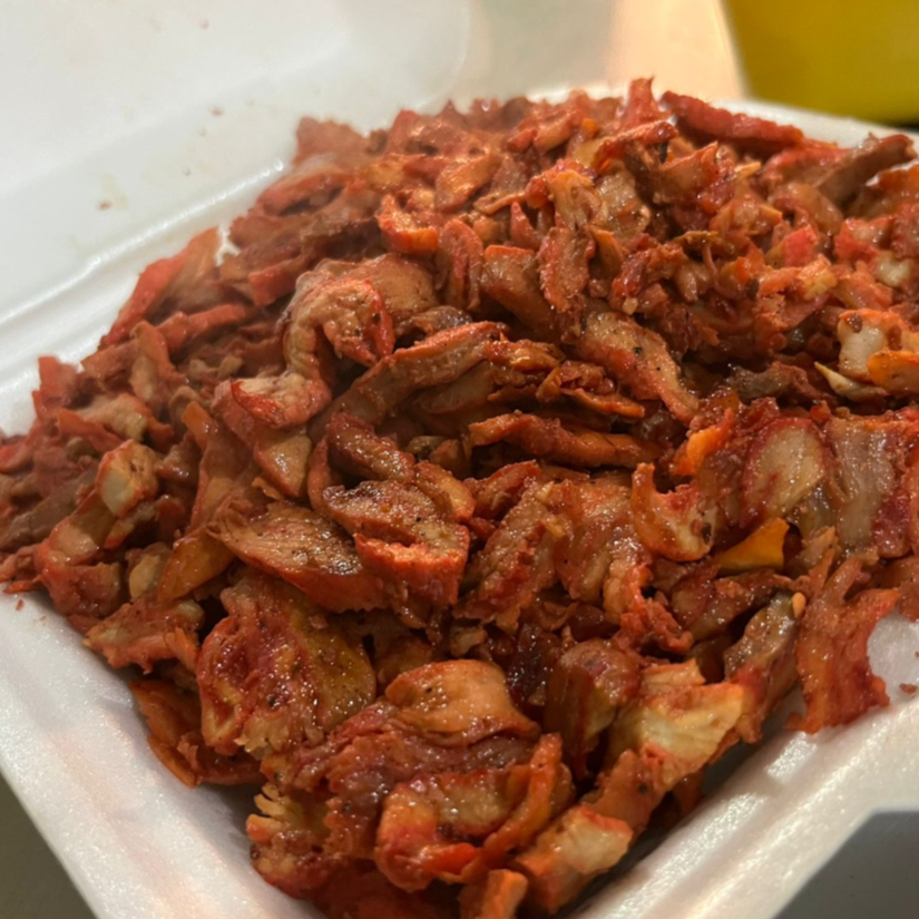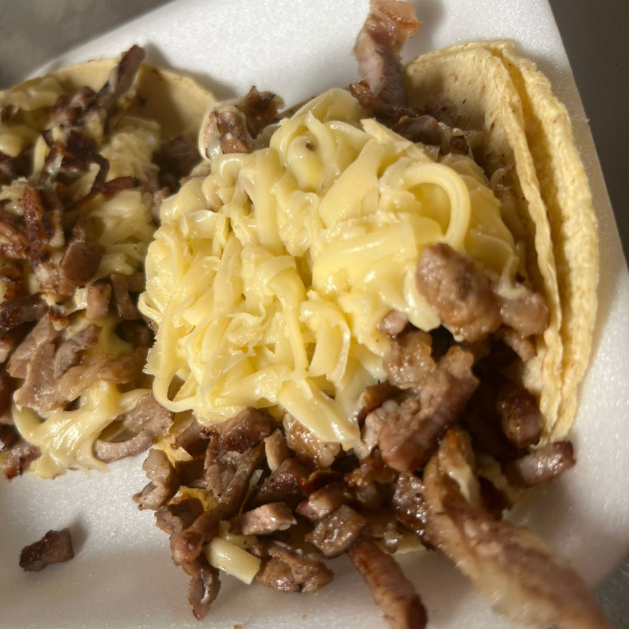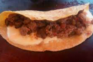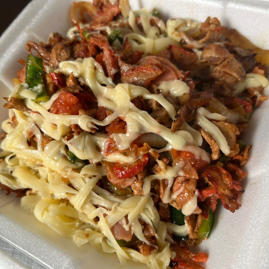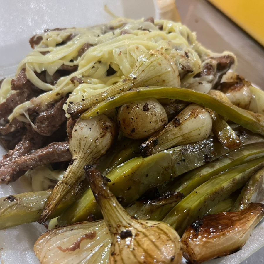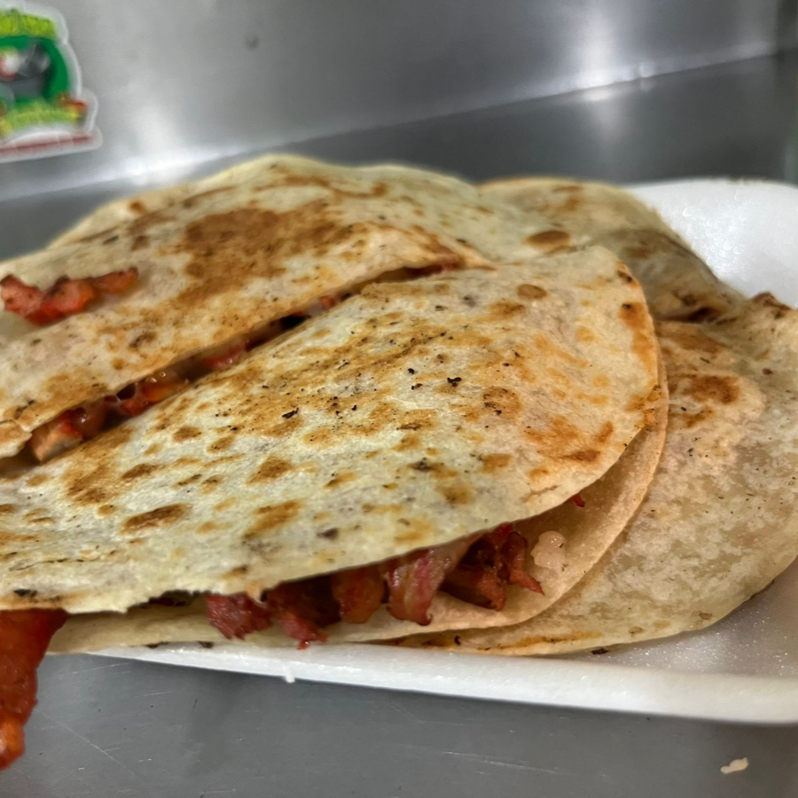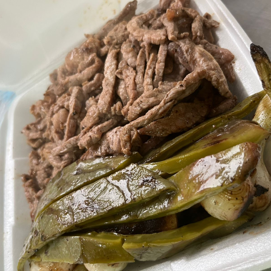 Arrachera, cebolla, poblano, tocino, jitomate y queso