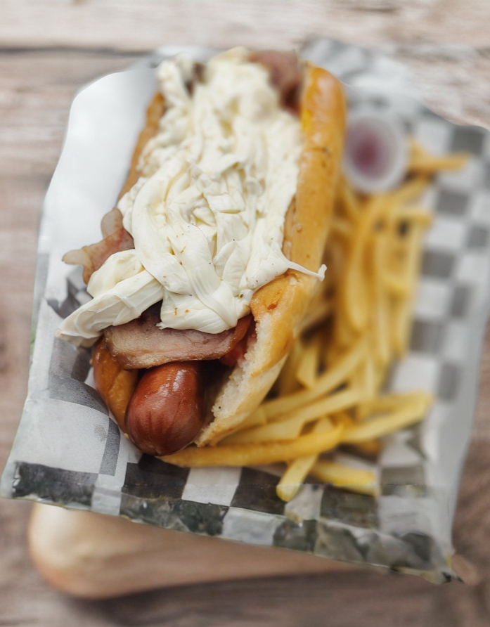 PAN ARTESANAL BRIOCHE, SALCHICHA POLACA, CARNE AZADA, ADEREZOS, TOMATE, CEBOLLA Y EXTRA QUESO FUNDIDO