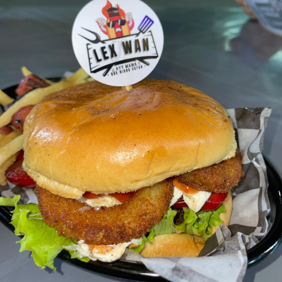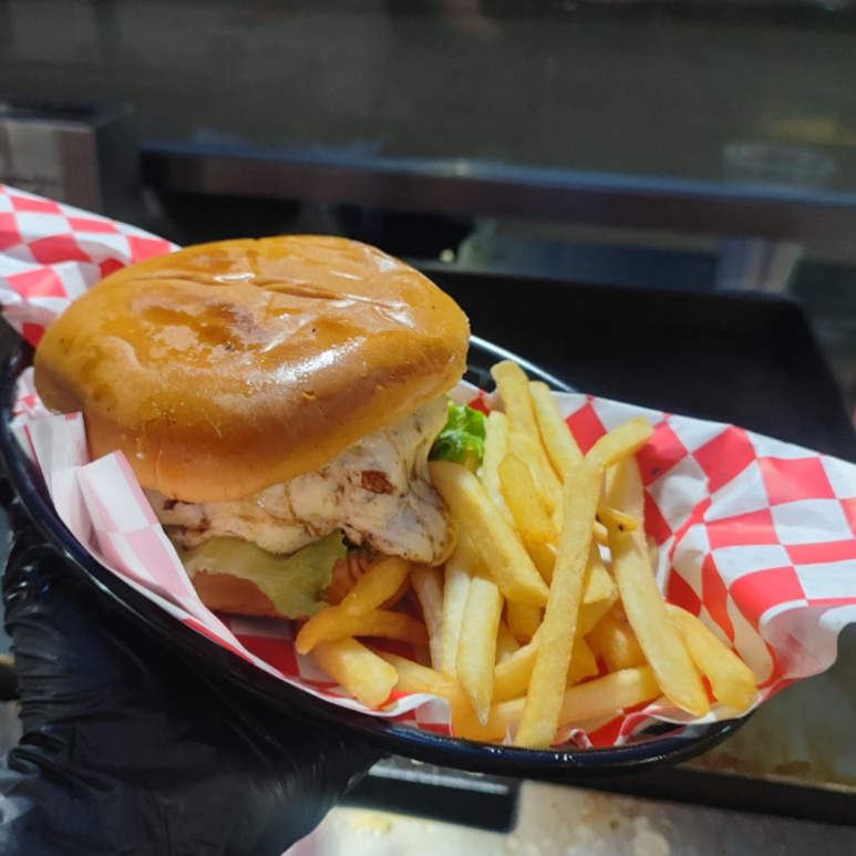 Pan Brioche, Pechuga de Pollo, Salsa de la Casa, Aderezos, lechuga, tomate, cebolla, Queso Fundido y una Porcion de Papas a la Francesa