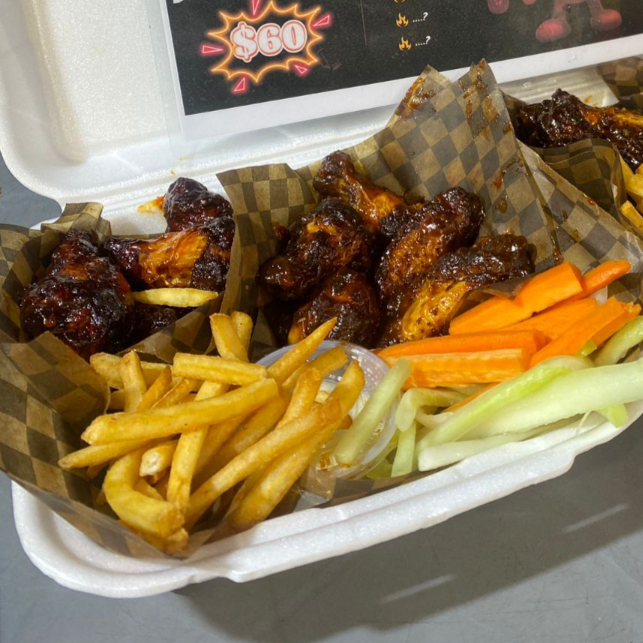 1O ALITAS DE SALSA A ELEJIR, ACOMPAÑADAS CON UNA PORCION DE PAPAS A LA FRANCESA, PEPINO, ZANAHORIA Y UN EXQUISITO ADEREZO RANCH