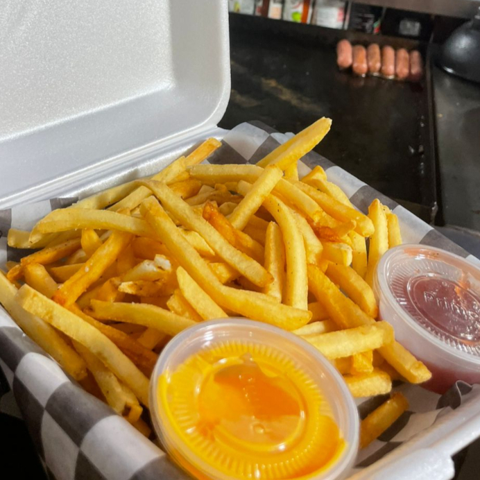 Pan Brioche, Carne de Res, Lechuga, Aderezos, Tomate, Cebolla, Queso Fundido, Mezcla de 3 Quesos y una Porcion de Papas a la Francesa