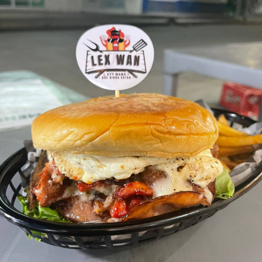 Pan Brioche, Carne de Res, Chorizo, Tocino, Aderezos, Lechuga, Tomate, Cebolla, Queso Fundido y una Porcion de Papas a la Francesa